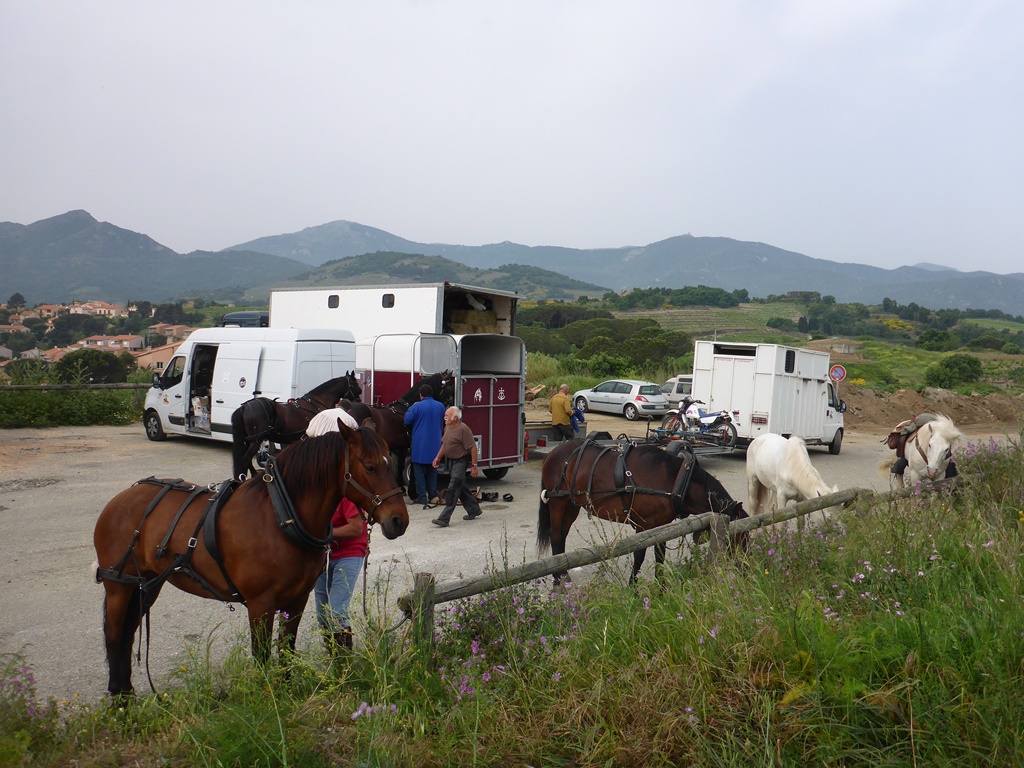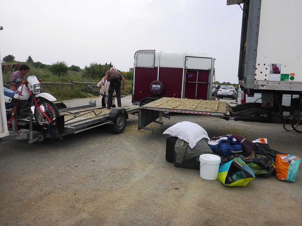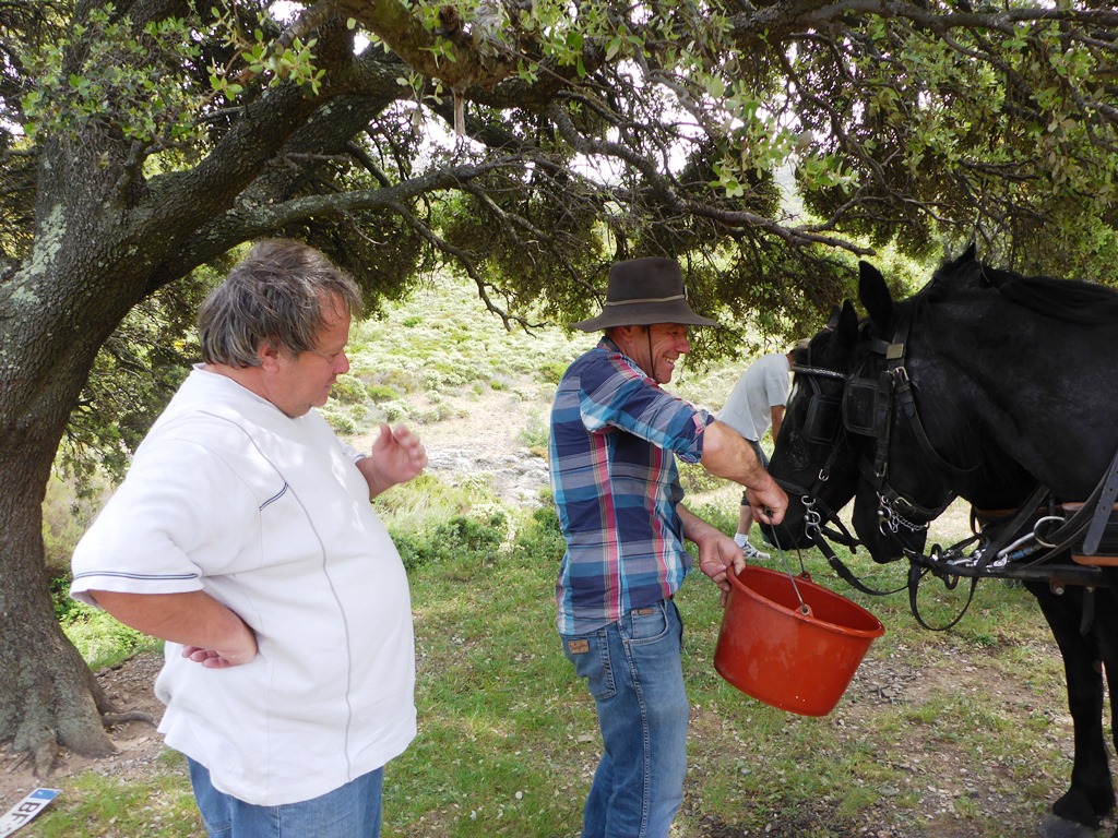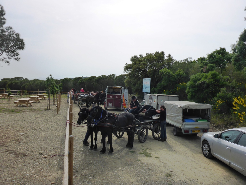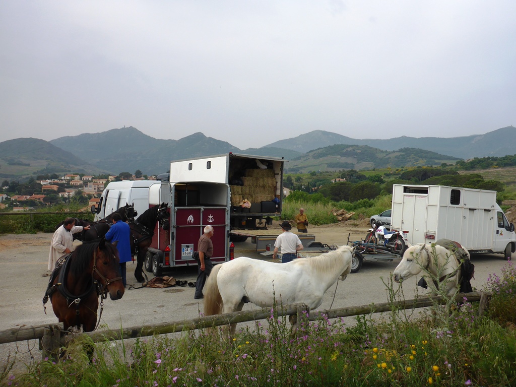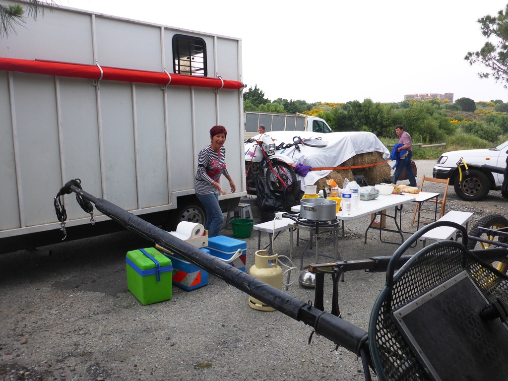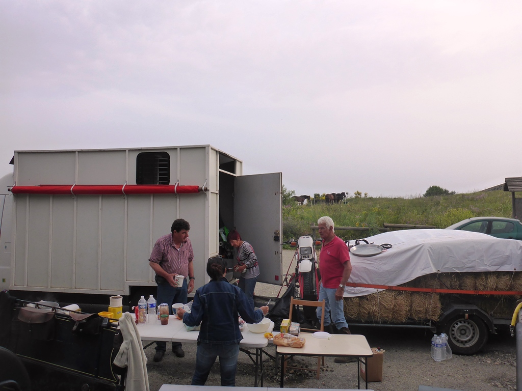 Un petit moment de détente et de repos de l'équipe d'intendance avant le passage des calèches et des cavaliers.