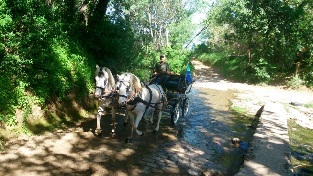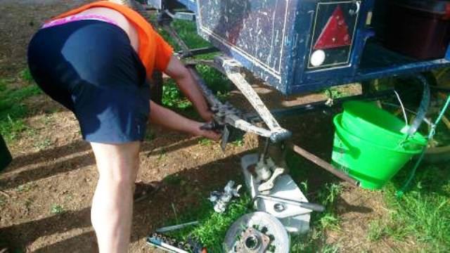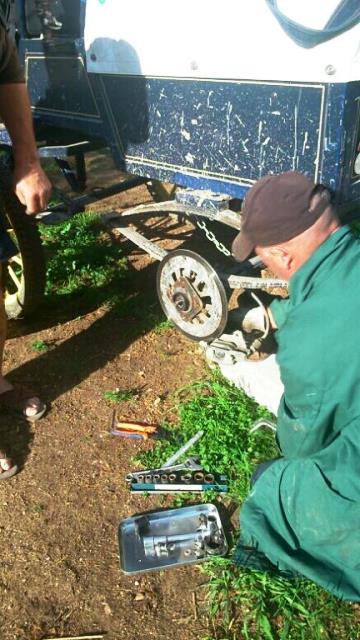Avant le départ,réparation de l'attelage Roland et Chantal pour un problème de roulement d'un essieu arrière.