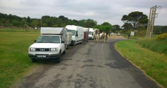 Il faut aussi saluer l'intendance qui nous suit. Maréchalerie,moto de repérage,van pour les chevaux fatigués,remorque de foin et granulés et camions pour la logistique et les repas.